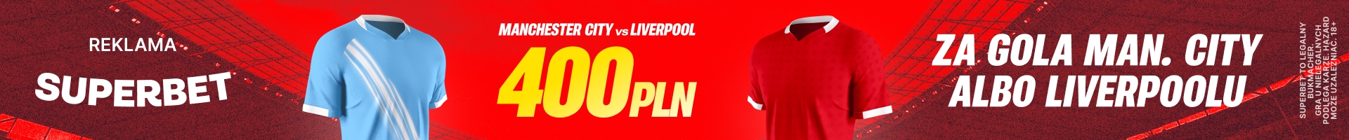 - Postaw pierwszy kupon singiel (dowolna stawka) na gola wybranej drużyny w meczu Manchester City – Liverpool w Premier League. Zakłady zaliczane do Promocji to: Liczba goli drużyny – Manchester City – powyżej 0.5 albo Manchester City strzeli gola – tak albo Liczba goli drużyny – Liverpool – powyżej 0.5 albo Liverpool strzeli gola – tak