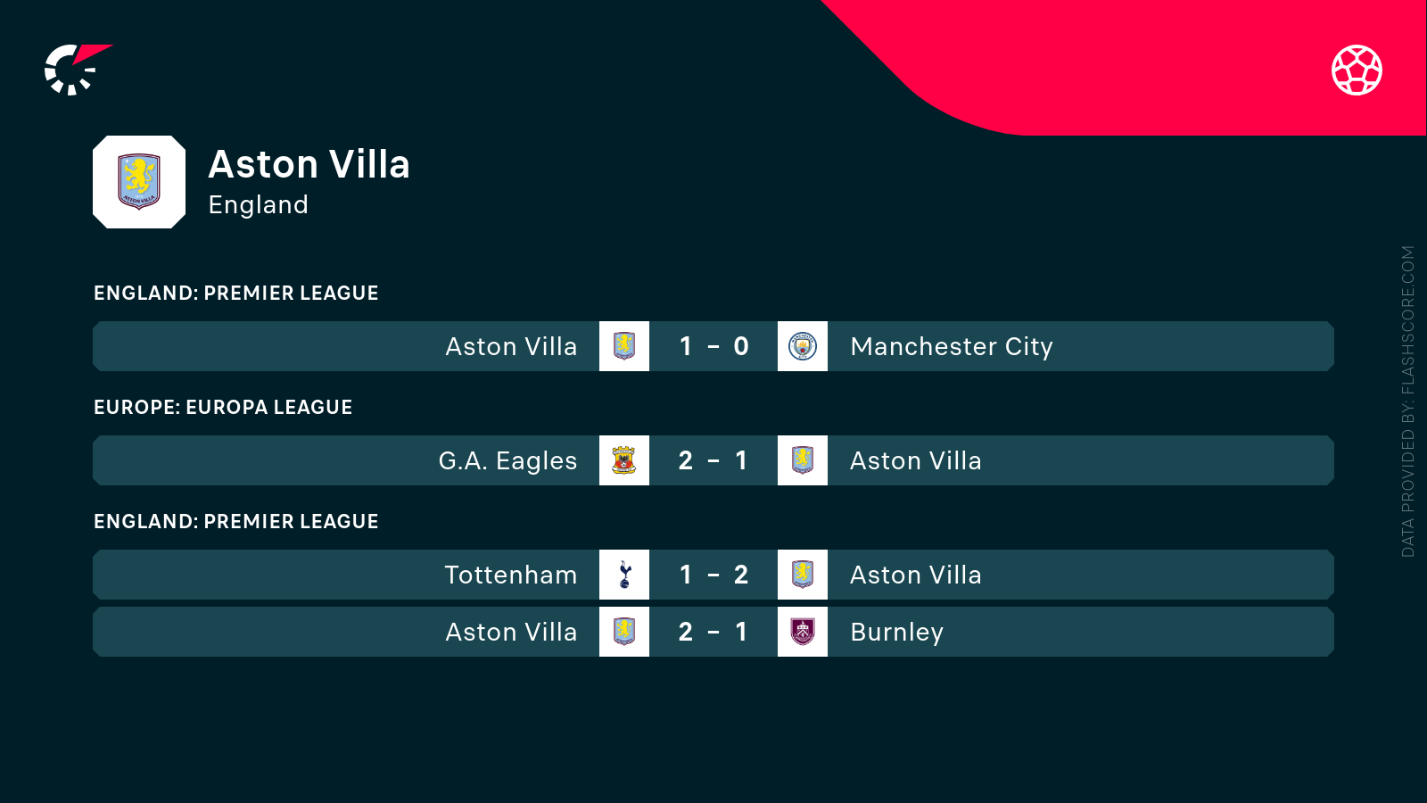 - 5 niedawnych spotkań Aston Villi to 4 zwycięstwa i 1 klęska.