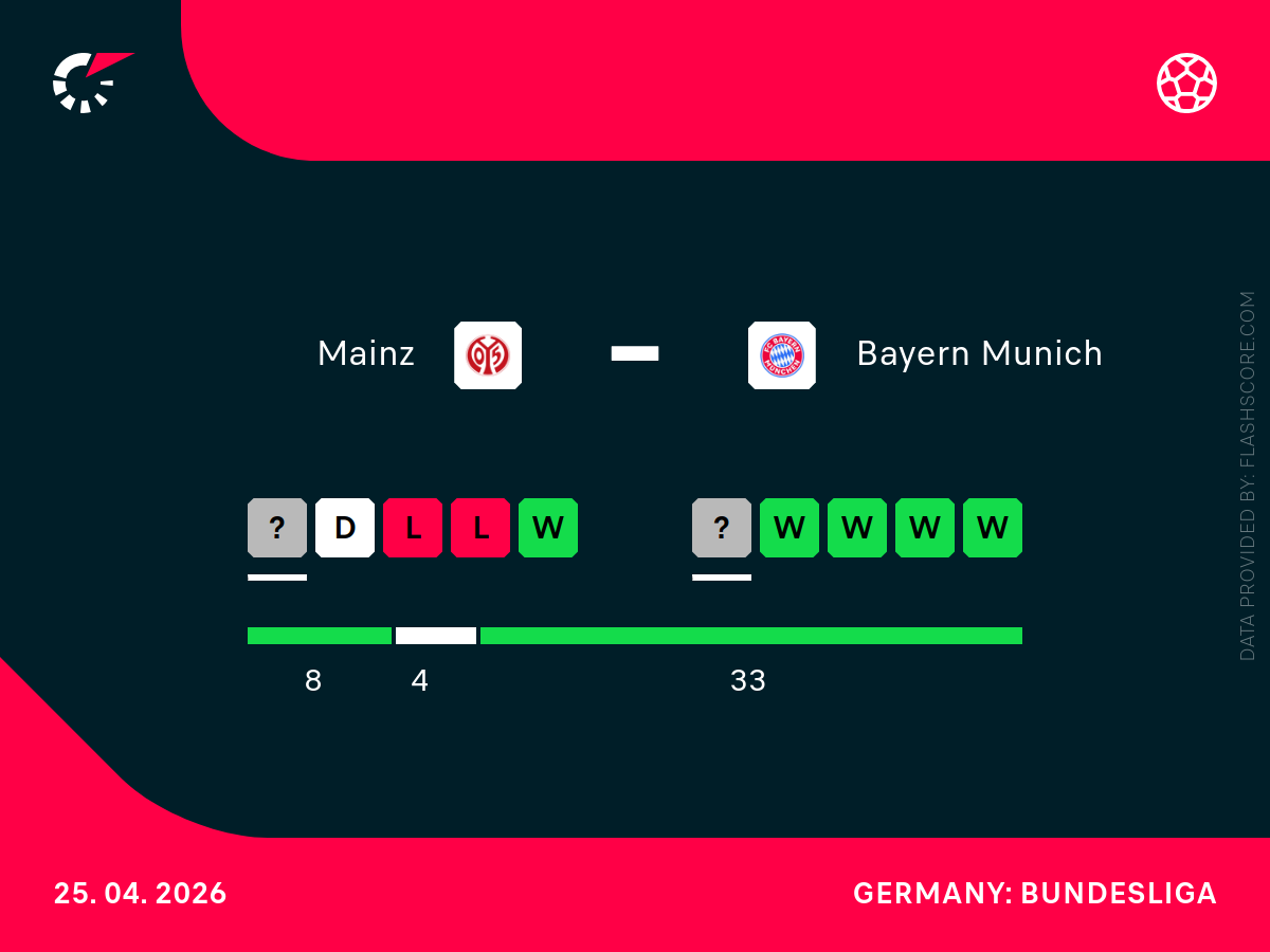 Mainz podchodzi do tego spotkania z bagażem 34 punktów na koncie. Ich ostatnie wyniki to przeplatanie dobrych momentów z gorszymi – niedawny remis 1:1 z Borussią Mönchengladbach pokazał charakter zespołu, jednak porażka z Freiburgiem obnażyła braki w defensywie. Mainz bazuje na solidności Nadiema Amiriego, który jest najskuteczniejszym zawodnikiem zespołu, ale przeciwko takiemu rywalowi jak Bayern, to może nie wystarczyć do zdobycia punktów.