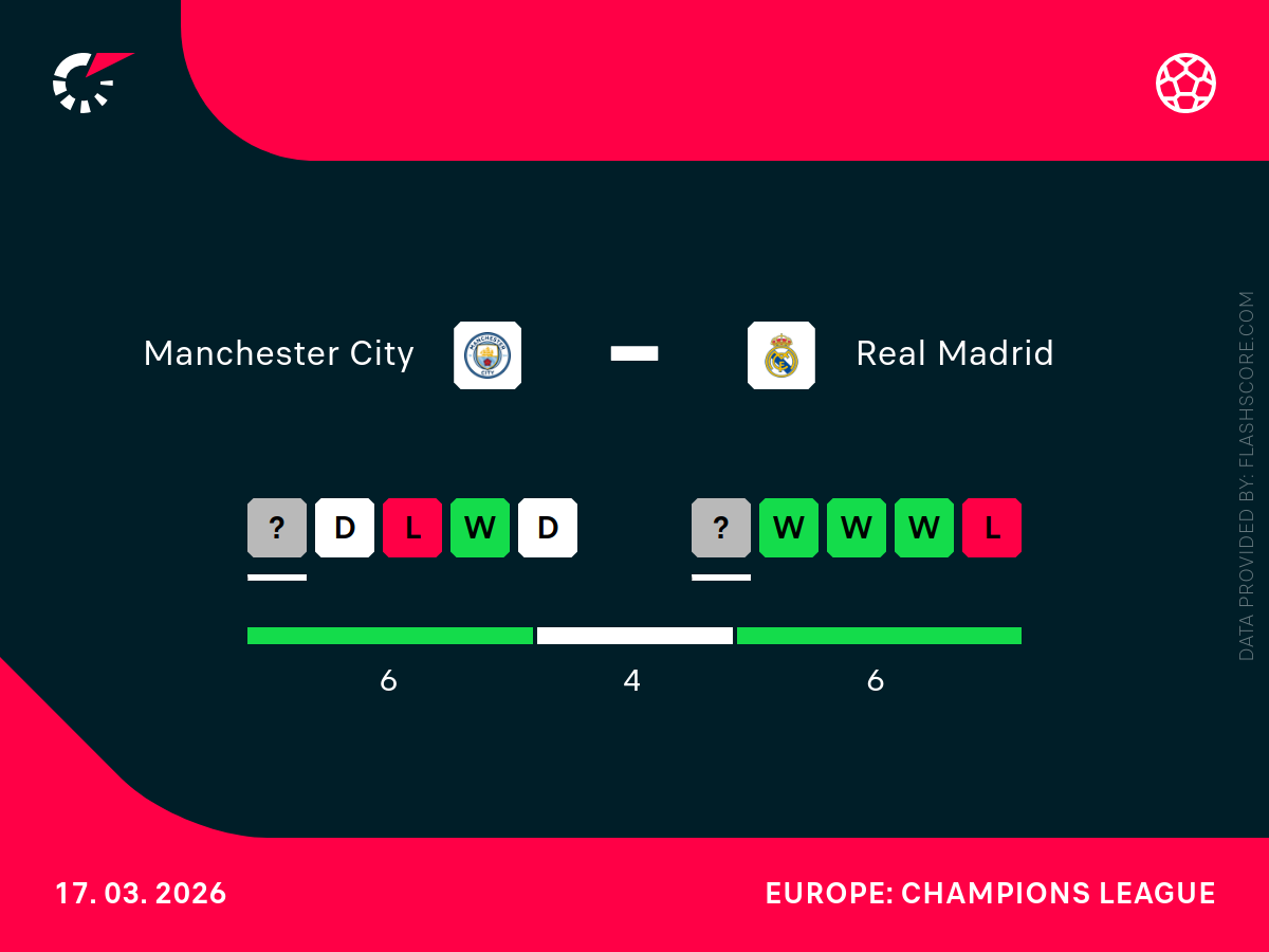 W ekipie gospodarzy niezdolny do gry jest J. Gvardiol, który zmaga się ze złamaniem nogi, oraz S. Nypan. Występ R. Lewisa stoi pod znakiem zapytania przez uraz kostki. Goście przyjadą bez Edera Militao, F. Mendy’ego, Rodrygo, D. Ceballosa oraz R. Asencio.