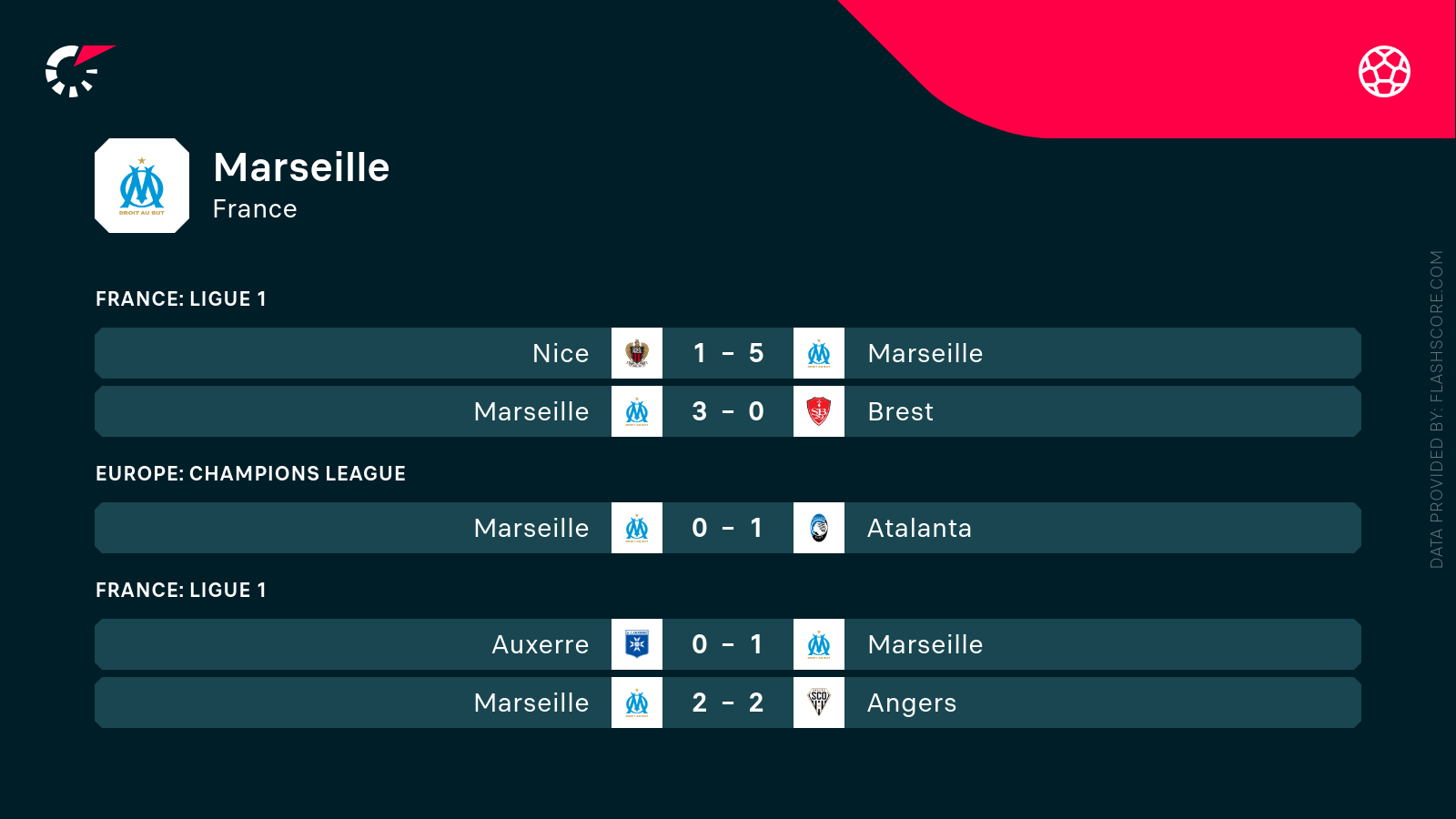- Marsylia zanotowała minimum 4 celne uderzenia w 4 z 5 poprzednich starć.