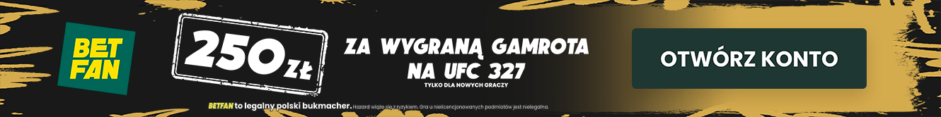 Załóż konto z kodem promocyjnym Betfan GRAMGRUBO i zgarnij 250 zł za wygraną Gamrota na UFC 327, oraz najwyższy pakiet startowy o łącznej wartości 625 zł!