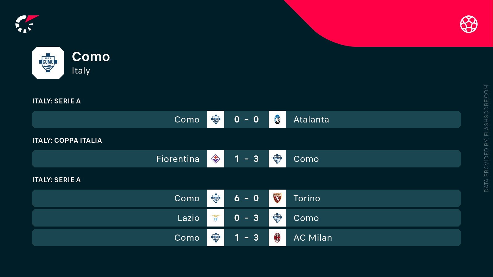 • 5 poprzednich występów Como to komplet 3 wygrane, 1 remis i 1 porażka.