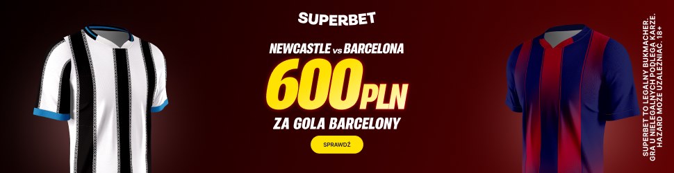 Kliknij w baner i sprawdź specjalną promocję, którą Superbet przygotował dla nowych graczy, którzy zarejestrują się do Superbet z kodem promocyjnym GRAMGRUBO. Polski legalny bukmacher płaci aż 600 zł za gola Barcelony z Newcastle! Szczegóły promocji poniżej.