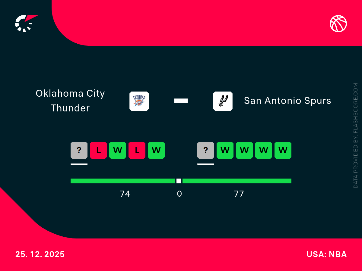 San Antonio Spurs również może pochwalić się bardzo dobrym bilansem 22 zwycięstw i 7 porażek, co potwierdza, że drużyna jest w ścisłej czołówce konferencji zachodniej i zasługuje na fotel wicelidera. Siłą Kogutów jest bardzo dobra ofensywa, oparta na szybkim tempie gry oraz indywidualnych umiejętnościach liderów, w tym Victora Wembanyamy, który odgrywa kluczową rolę w ataku i obronie, jednak ostatnie problemy zdrowotne nieco hamują młodego Francuza. Zespół z San Antonio nie ma wielkich problemów kadrowych, jednak po ostatnim meczu, właśnie przeciwko City Thunder, Wembanyama zgłaszał problemy zdrowotne związane z odnawiającą się kontuzją łydki.