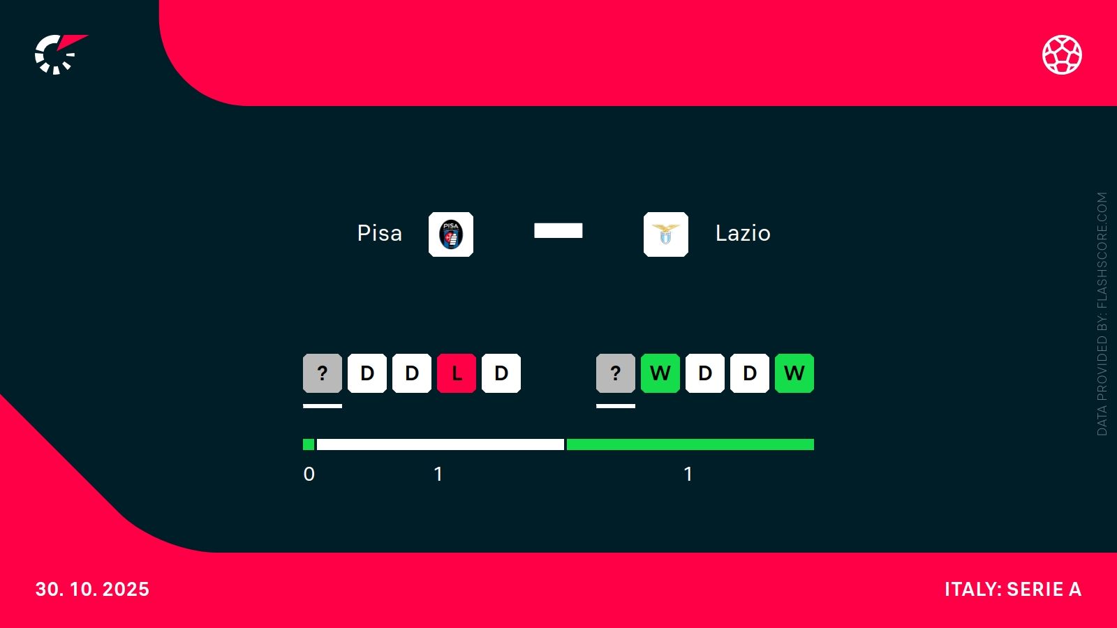 Pisa nie wygrała jeszcze żadnego spotkania w lidze w tym sezonie. Ich ostatnie spotkania to same remisy i porażki, jednak w ostatniej kolejce remis odniesiony z Mediolanie z tamtejszym Milanem to niewątpliwie sukces. Zespół wciąż szuka zwycięstwa i kilkukrotnie było blisko tego osiągnięcia, tak jak np. w starciu z Veroną dwie kolejki temu, gdzie ostatecznie padł wynik 0:0.
