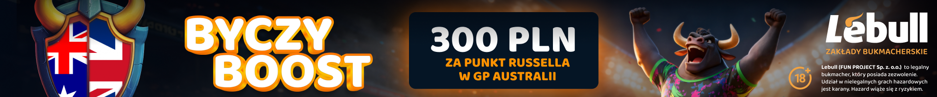 Przy współpracy z Lebull – czołowym liderem rankingu bukmacherów, mamy dla Was znakomitą promocję – 300 zł za punkt Russella w GP Australii, a także dodatkowo bonus powitalny w wysokości 730 złotych. Więcej o bonusie od 2. i 3. depozytu, a także o freebetach (łącznie 40 PLN), przeczytasz w kodzie promocyjnym Lebull.