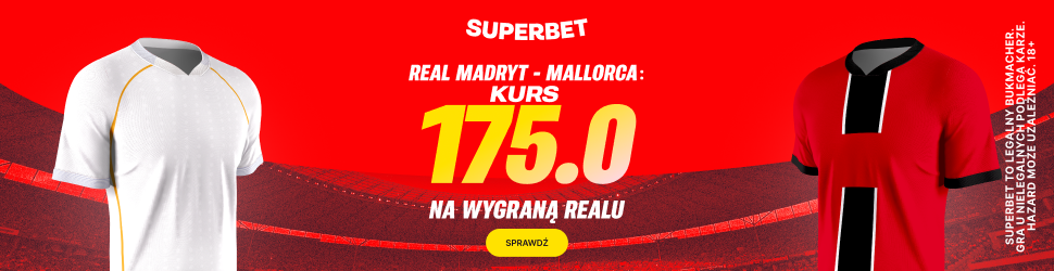 Załóż konto z kodem promocyjnym Superbet GRAMGRUBO i zagraj wygraną Realu Madryt z Mallorcą po kursie 175! Promocja łączy się z ofertą powitalną, gdzie do zyskania jest jeszcze aż 3755 PLN! Po szczegóły kliknij w baner!