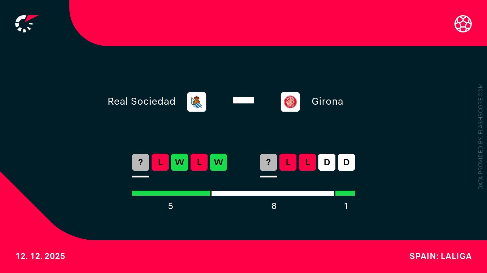 Girona znajduje się w kryzysie. Ich bilans ostatnich pięciu spotkań to zwycięstwo, dwa remisy i dwie porażki. Najbardziej niepokojący był ich ostatni występ, kiedy to zostali rozbici przez Elche aż 0:3. Co prawda, udało im się zremisować z Real Madryt, co było sensacją, jednak sądząc po wynikach był to wypadek przy pracy.