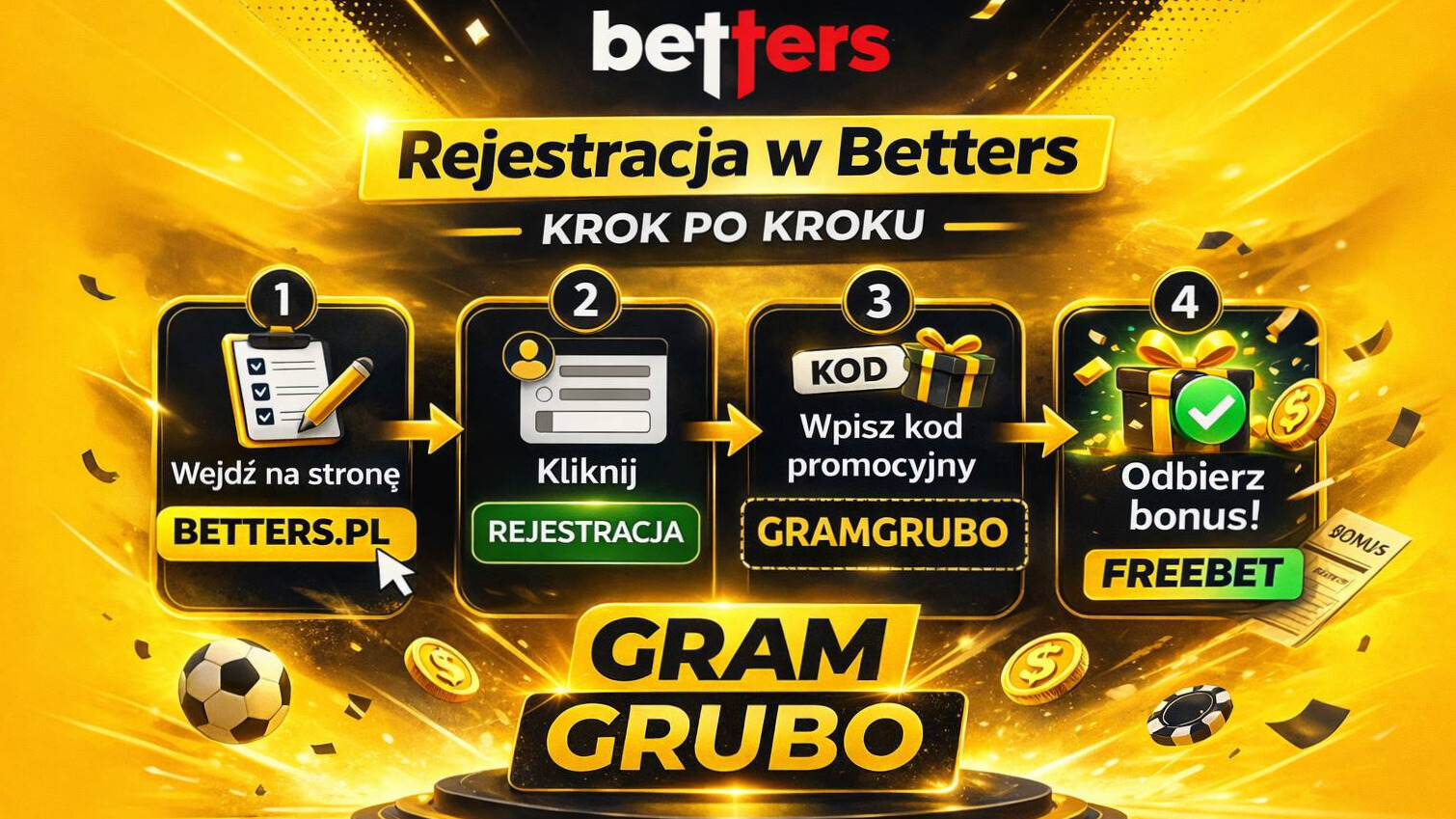 - Rejestrując się przez kod GRAMGRUBO klikając tutaj otrzymasz do 1230 zł w bonusach i 10 zł freebetu, co jest najlepszą ofertą na rynku!