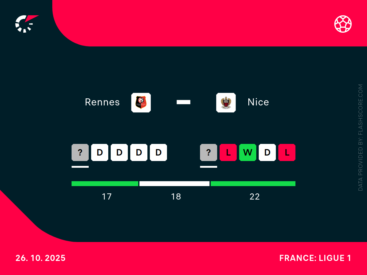 - Ostatnie 6 starć bezpośrednich zakończyło się 3 wygranymi Rennes i 3 wygranymi Nice