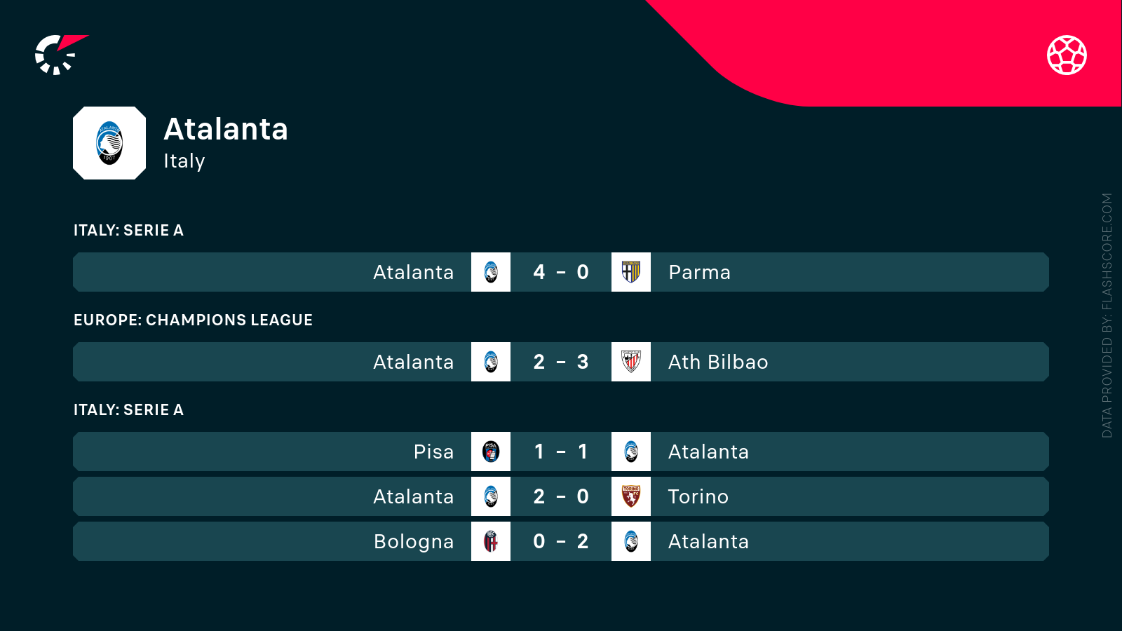 - 5 niedawnych spotkań Atalanty to 3 zwycięstwa, 1 remis i 1 porażka.