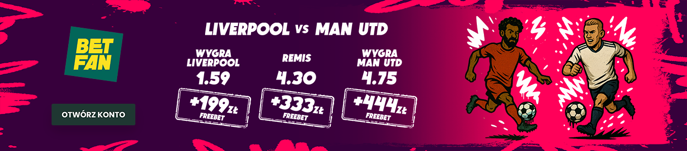 Kliknij w baner, by zarejestrować się z naszym kodem promocyjnym Betfan GRAMGRUBO i zgarnij do 444 PLN bonusu za wytypowanie spotkania Liverpool – Manchester United!