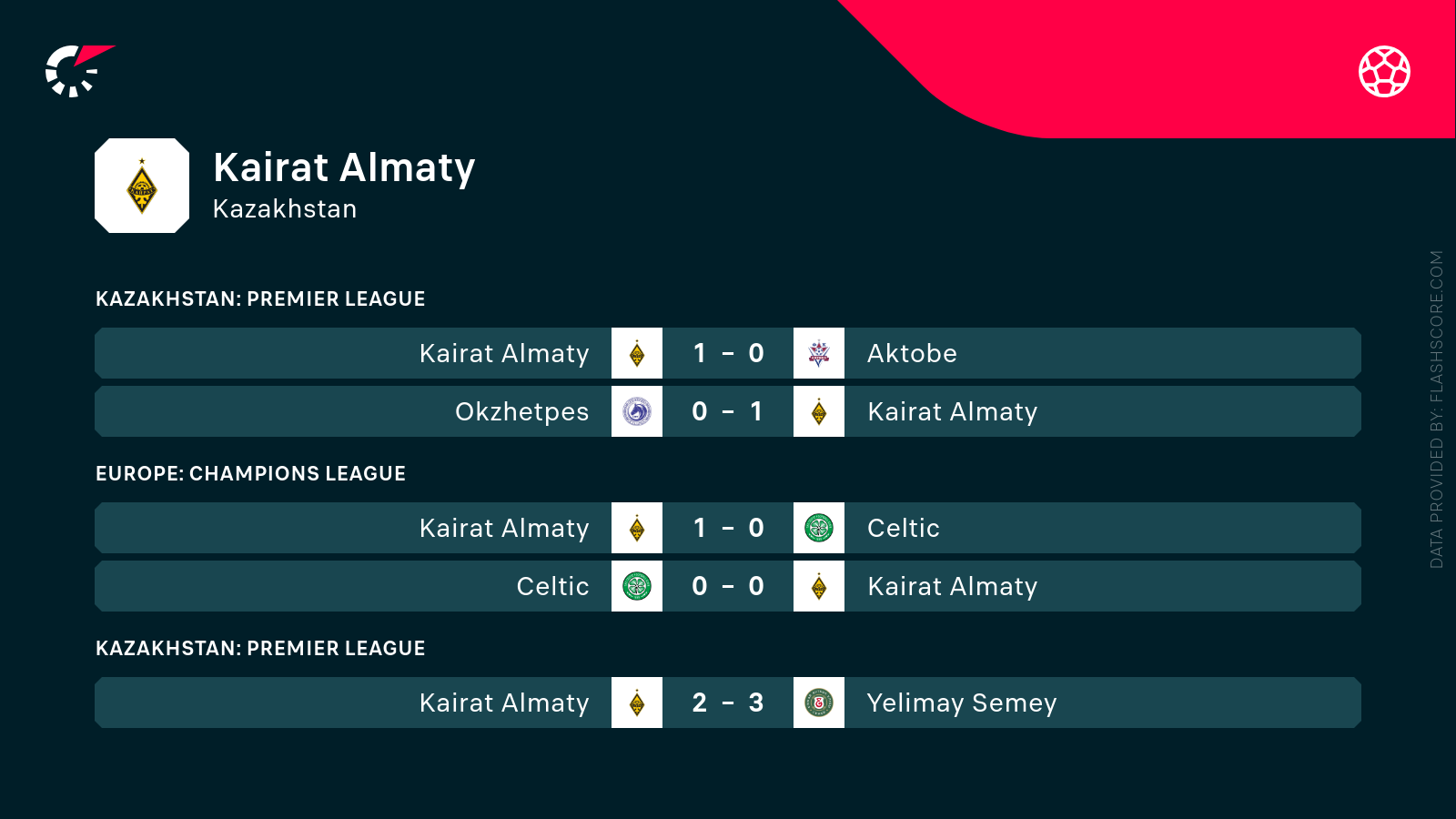 - Kairat wygrał 2 z 5 potyczek wstecz.