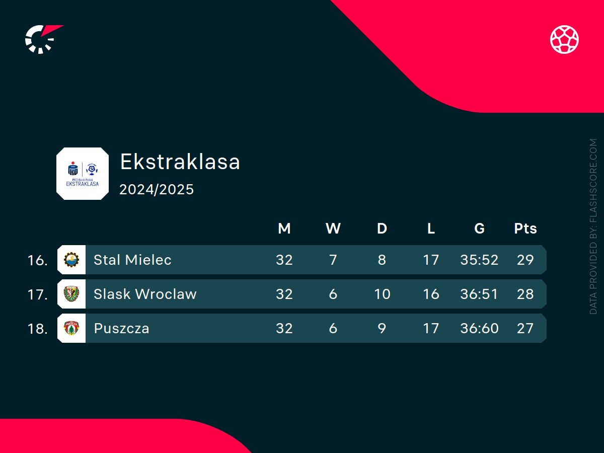 Stal Mielec pożegnała się z Ekstraklasą mimo zwycięstwa nad Puszczą (3:2) w ostatniej kolejce. Katem dla zespołu z podkarpacia okazała się Lechia, która dzięki zwycięstwie z Cracovią zapewniła sobie utrzymanie jednocześnie pozbawiając szans na utrzymanie zarówno Stali jak i Śląska. Obiektywnie patrząc to trójka spadkowiczów zasłużyła na to by za rok grać w I lidze, bo poziomem sportowym odstawała od pozostałych ekip. Radomiak niewiele ma już do zyskania, ale nie zamierza składać broni co pokazał chociażby u siebie z Lechem (2:2) oraz w ubiegły weekend z Pogonią (2:0).