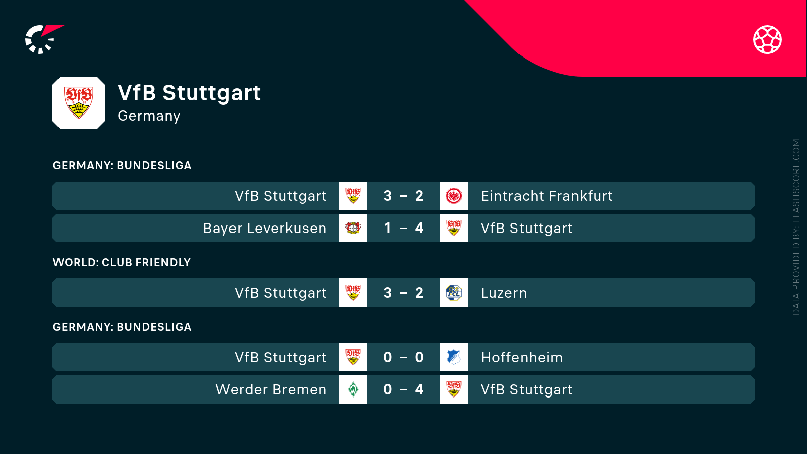 - 5 poprzednich spotkań Stuttgartu to 4 wygrane i 1 porażka.