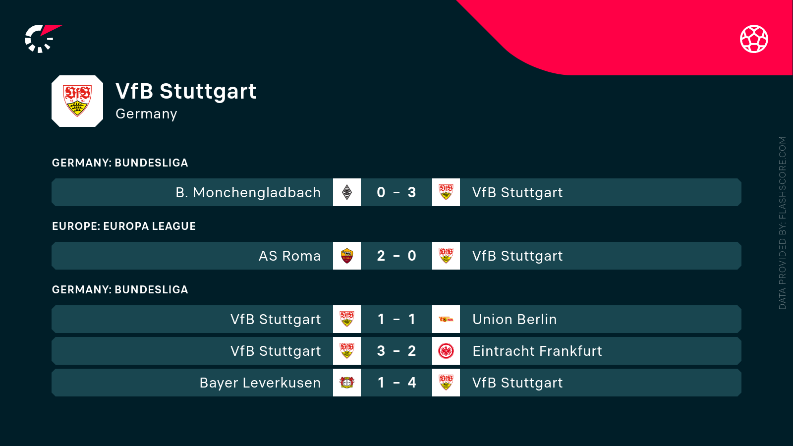 - 5 poprzednich meczów Stuttgartu to 3 zwycięstwa, 1 remis i 1 klęska.