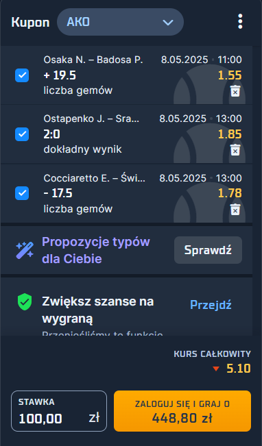 Zakłady i typy bukmacherskie można obstawiać non stop. Na stronie Gram Grubo znajdziesz eksperckie typy, kupony AKO, a także codziennie eksperckie kupony do zagrania. Świat zakładów bukmacherskich jest tak rozbudowany, że każdy znajdzie coś dla siebie. Podmioty przyjmujące zakłady mają w swojej ofercie wiele dyscyplin. Kupon dnia to seria, w której pomagamy wygrywać, udostępniając najlepsze naszym zdaniem typy bukmacherskie połączone w jeden kupon. Kupon bukmacherski na 08 maja to propozycja składająca się z trzech zdarzeń z kursem 5.10! Sprawdź najlepsze typy bukmacherskie Gram Grubo na dziś.