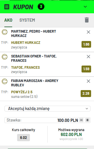 Biorąc pod uwagę dotychczasowe wyniki bezpośrednich pojedynków oraz doświadczenie Hurkacza, faworytem meczu wydaje się być Polak. Jednak forma Martíneza na kortach ziemnych sugeruje, że spotkanie może być wyrównane i dostarczyć wielu emocji. Stawiam jest na wygraną Huberta.