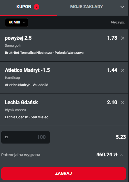 Zakłady i typy bukmacherskie można obstawiać non stop. Na stronie Gram Grubo znajdziesz eksperckie typy, kupony AKO, a także codziennie eksperckie kupony do zagrania. Świat zakładów bukmacherskich jest tak rozbudowany, że każdy znajdzie coś dla siebie. Podmioty przyjmujące zakłady mają w swojej ofercie wiele dyscyplin. Kupon dnia to seria, w której pomagamy wygrywać, udostępniając najlepsze naszym zdaniem typy bukmacherskie połączone w jeden kupon. Kupon bukmacherski na 14 kwietnia to propozycja składająca się z trzech zdarzeń z kursem 5.23! Sprawdź najlepsze typy bukmacherskie Gram Grubo na dziś.