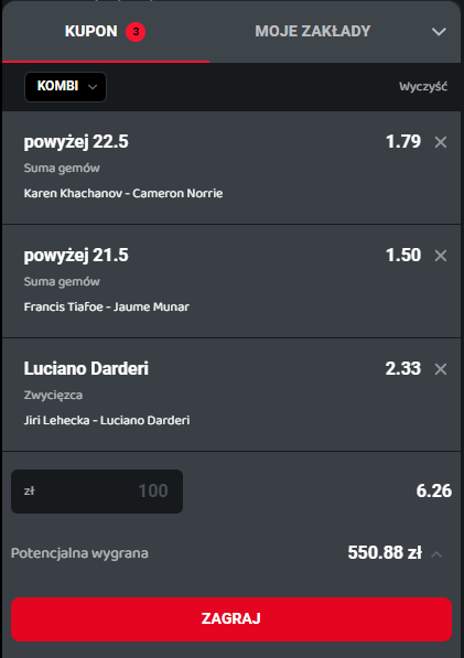 Luciano Darderi znajduje się w doskonałej formie w ostatnich tygodniach. Dwudziestotrzyletni włoski tenisista osiągnął dwa finały z rzędu , w Naples musiał uznać wyższość Vita Koprivy, ale w ATP Marrakechu sięgnął po tytuł, pokonując w finale Griegspoora. Dzięki triumfowi w Maroku Darderi awansował na 48. miejsce w rankingu ATP, co jest jego najwyższą pozycją w karierze. Włoch gra odważnie, bez kompleksów i prezentuje świetną dyspozycję. W przeciwieństwie do swojego rywala, którego forma ostatnio bywa bardzo nierówna, Darderi wydaje się być w znakomitej kondycji. Stawiam w tym spotkaniu na wygraną Darderiegi.