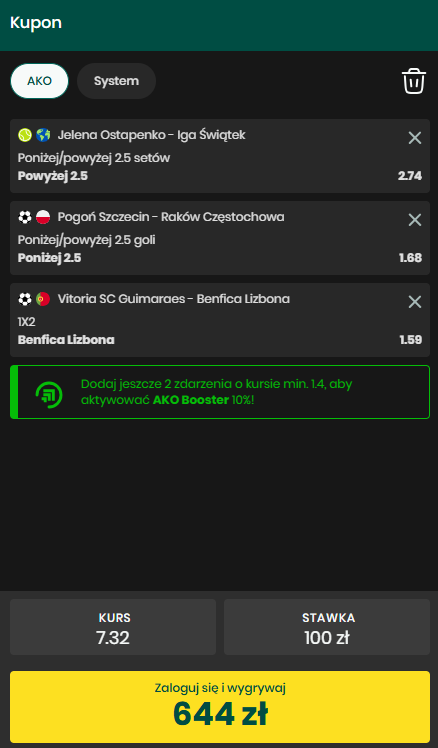 - Postaw swój pierwszy kupon SOLO lub AKO za dokładnie 30 zł i umieść na nim dowolny zakład z oferty na Premier League, LaLiga, Serie A, Bundesligę lub Ligue 1 (Łączny kurs kuponu musi wynieść minimum 2.00 i kupon musi zostać rozliczony do 19.04, godz. 23:59)