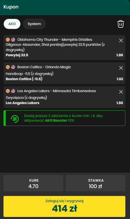 4. Aby aktywować bonus musisz zagrać za równowartość wpłaconej kwoty (dowolny kurs i liczba zdarzeń)