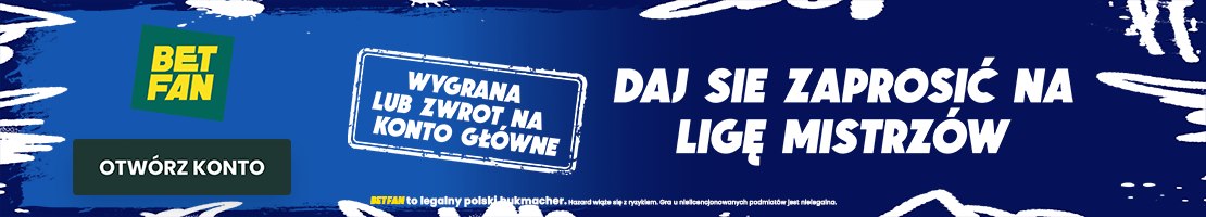 Zarejestruj się z kodem promocyjnym BETFAN „GRAMGRUBO” i zgarnij zakład bez ryzyka na Ligę Mistrzów 20 albo 40 PLN (stawka do wyboru) ze zwrotem na konto główne! KLIKNIJ TUTAJ albo w poniższy baner