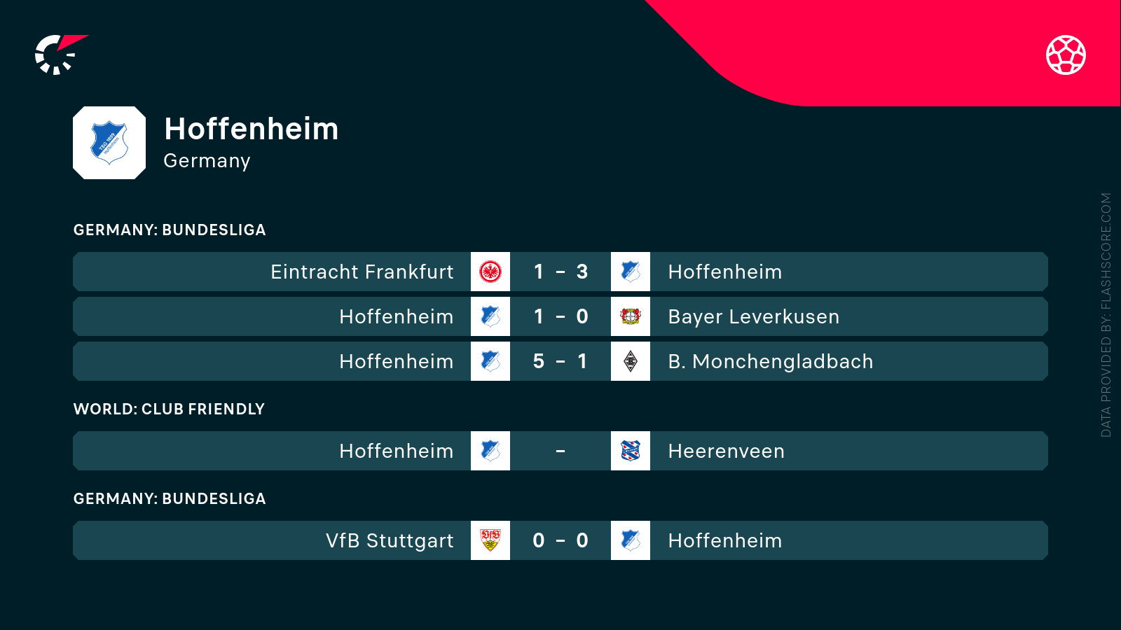 • 5 ostatnich gier Hoffenheim to 4 wiktorie i 1 remis.