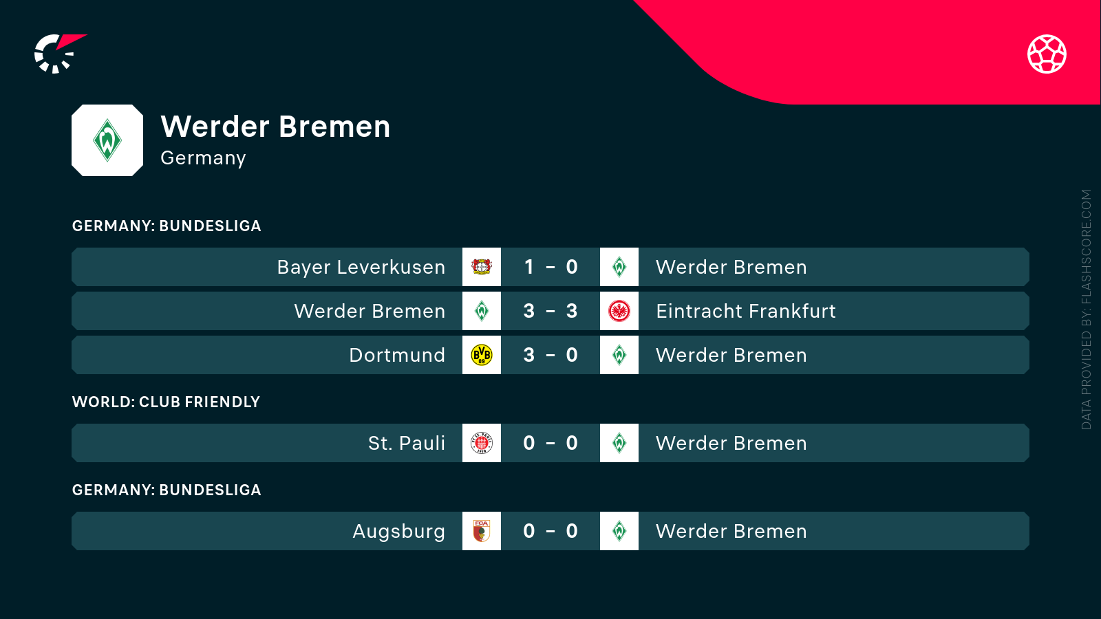 • 5 niedawnych spotkań Werderu to 3 remisy i 2 porażki.
